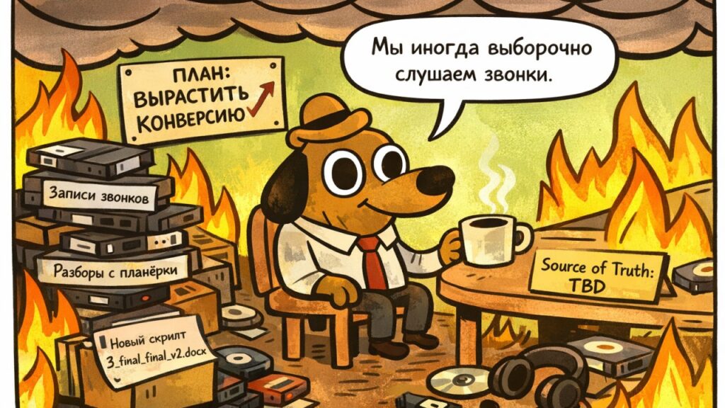 Отдельно лежит запись, отдельно — карточка лида, отдельно — PDF со скриптом в Notion. В голове у менеджера ещё своя версия. Никакого единого Source of Truth нет.